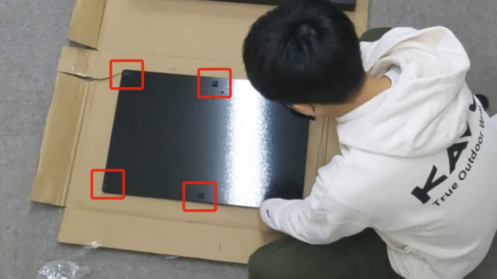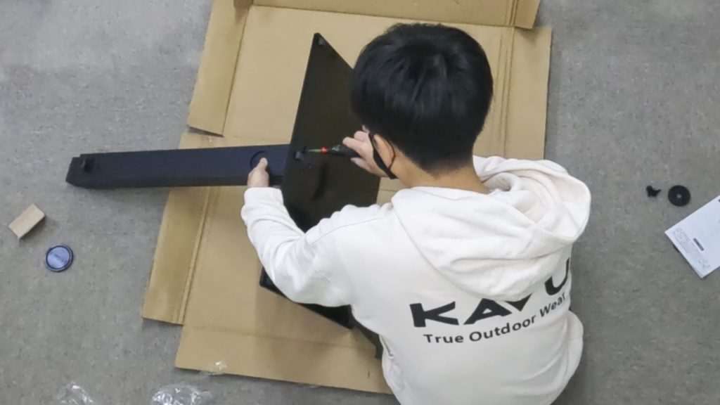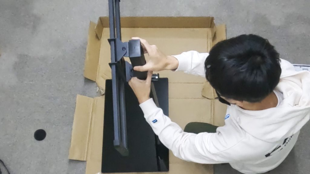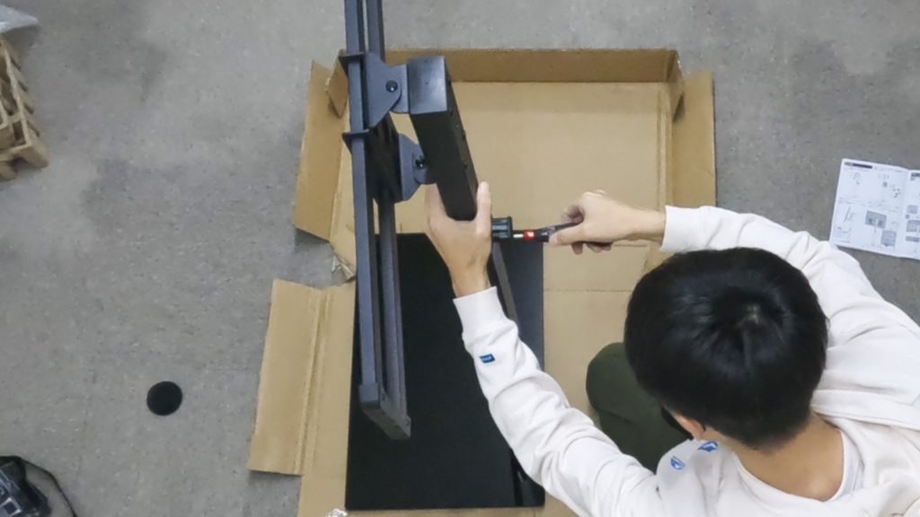 一番の難関は支柱と土台をを接続することでした。以前組み立てたテレビ台でも苦戦したのですが、垂直に保ちつつねじ止めするのは2人いたほうが絶対に楽です。