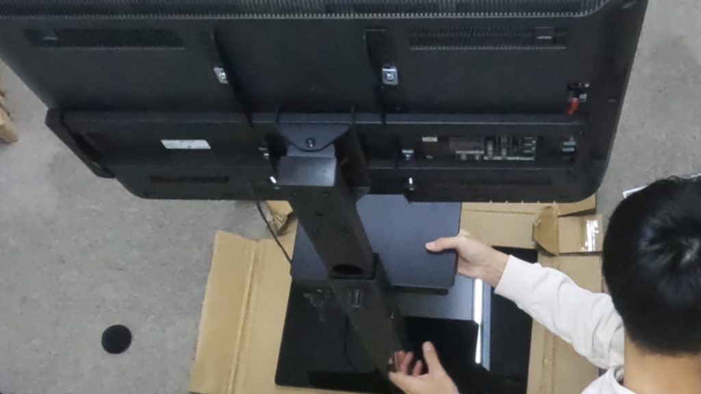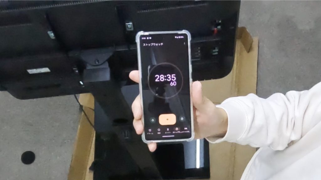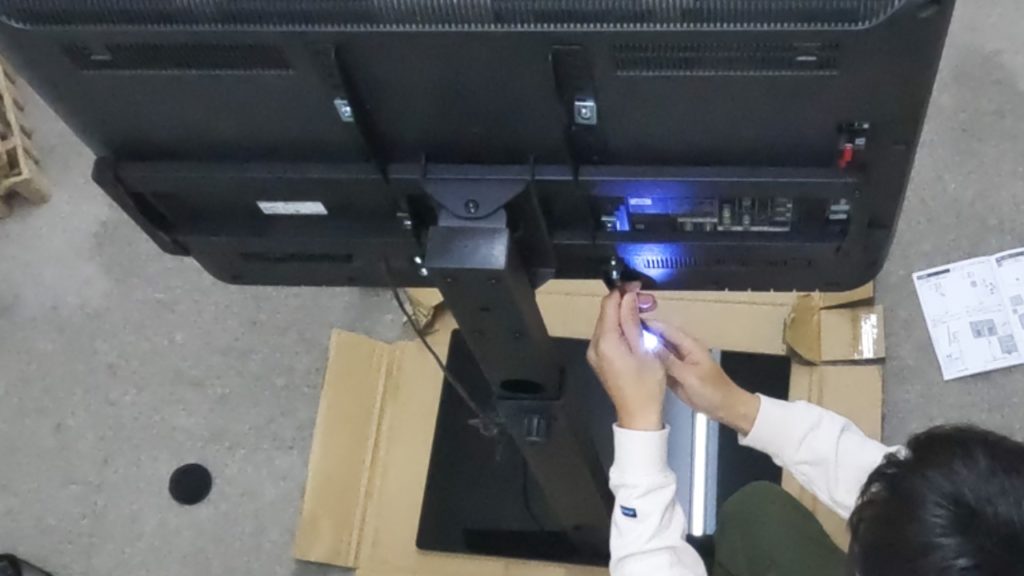 今回は32インチの比較的軽いテレビ(多分約10kg程度)だったのでテレビスタンドに簡単に取り付けられましたが、20kg以上あるテレビを運んだり裏返しにしたり持ち上げたりする事はできないと思います。説明書にはしっかり2人でやってくださいと明記されています。